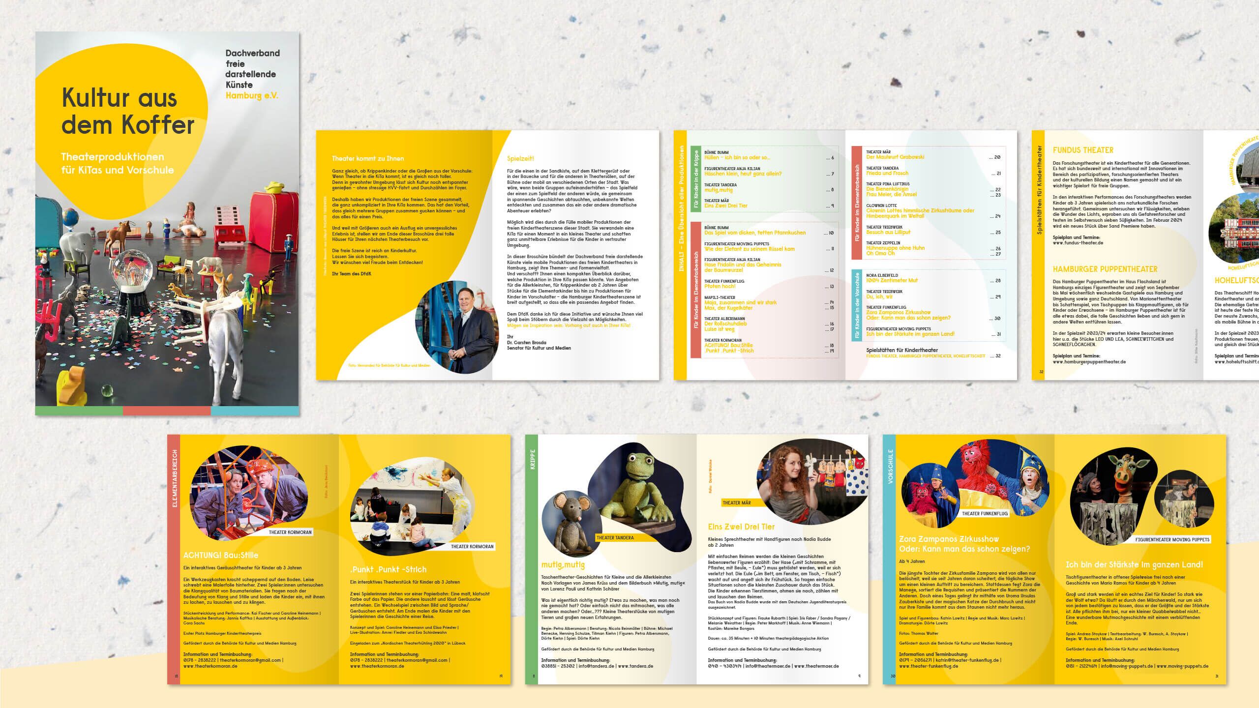 Gestaltung einer Broschüre des Dachverbands für die Hamburger Elbkinder KiTas, in der Kindertheaterproduktionen der freien Szene gesammelt vorgestellt werden.